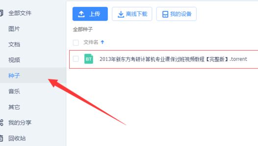 3、我们打开百度网盘,点击种子,找到我们刚刚上传的.torrent结尾文件,如图: