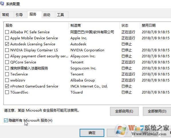 2、点击”服务”标签卡,选择”隐藏所有的微软服务”,然后点击全部禁用,如图所示: