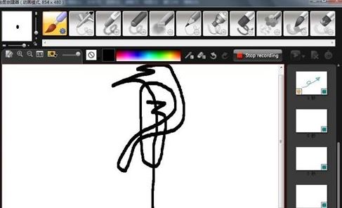 4、现在我们实际操作,我们画一个一笔的“鸟”,调整好和颜色及笔尖的粗细,点击开始录制按钮,点击后开始按钮由圆形变成方形,如图所示: