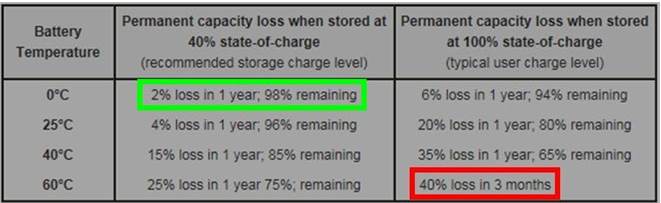 如下实验数据表明,电池温度较低的环境下、且维持 40%左右的电池电量的条件下,1 年内电池容量的损耗非常有限。反之,如果电池在