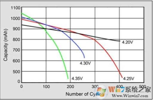 3)电池(电芯)充电电流、电压不可过高。通过以下实验数据曲线表明,电池电芯的电压在 4.2V 可实现的充电次数明显的比 4.35V 的条件下要高;电芯在长期过压或欠压的条件下,电芯化学活性的将发生急剧变化。这也从另外一个角度说明电池电量一直维持 100%电量时,对电池寿命的负面影响。