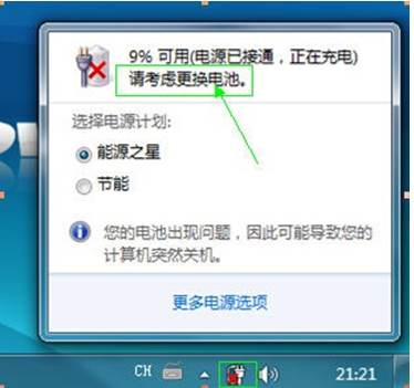 在微软 Window 7 操作系统下,任务栏出现“红叉”电源图标,点击后出现“请考虑更换电池”提示信息情形。典型参考视图如下:
