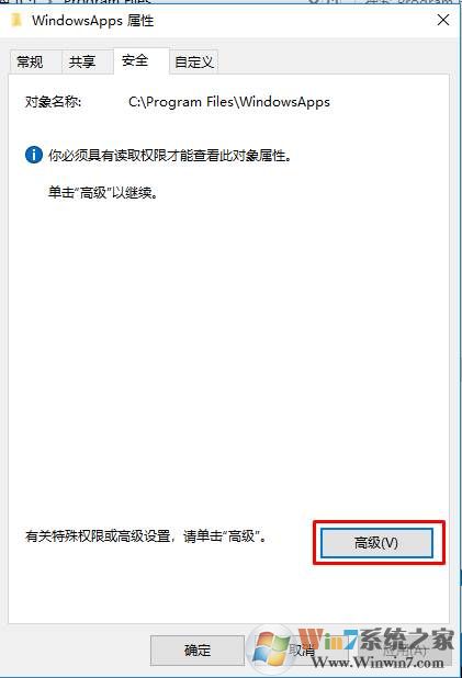 1、首先右键点击WindowsApps文件夹,然后来到安全选项卡,点击高级按钮;