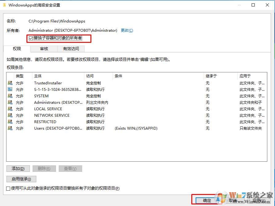 4、确定之后,所有者就变成Administrator了,勾选替换子容器的对象的所有者(表示里面的子文件夹也一并修改),确定