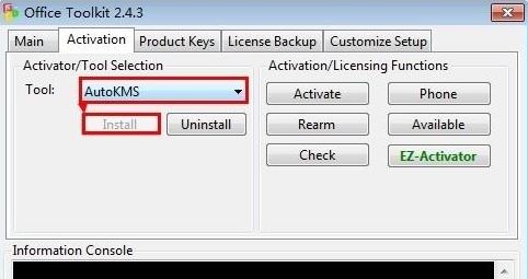 2、进入Microsoft Toolkit设置界后,点击Activation 选项卡下面选择要安装一个AutoKMS,如图所示: