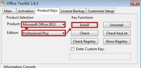 3、再点击Product Keys选项卡下面选择你要激活的软件,选好软件版本以后,点击【Install】安装好以后,就需要重启电脑,此时再运行软件就完成激活了,如图: