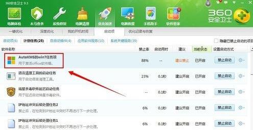 4、重启电脑后如果360提示是否禁用AutoKMS一定不能禁用,如果禁用了Microsoft Toolkit所做的激活动作都没有效果了。