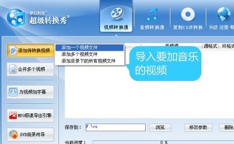 2、下载后进行解压安装,然后打开超级转换秀这款软件,点击“视频转换通”选项卡面板左上角的“添加待转换视频”按钮,将要加音乐的视频导入;