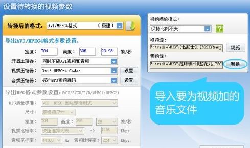 3、导入视频进入“设置待转换的视频参数”对话框后,在右上角“音频源”处,点击“替换”按钮,将要替换进入视频的音乐文件导入,给视频加音乐的过程就完成了