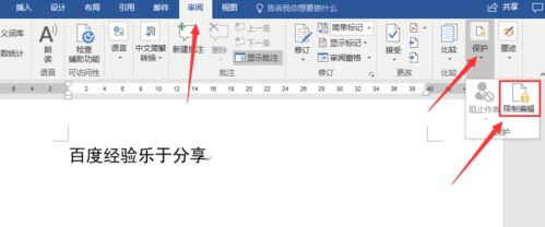 2、接着我们点击【审阅】菜单下的【保护】的子选项【限制编辑】按钮,如图:
