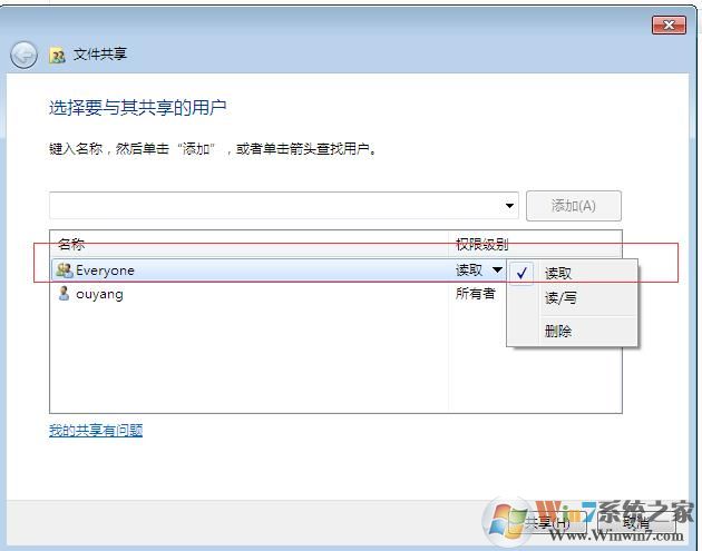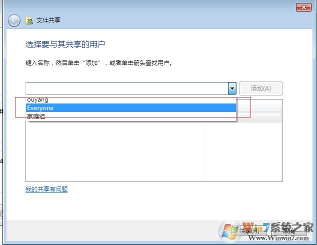 3、选择Everyone,这里选择Everyone,别人访问就不需要密码,比较方便,如果需要别人输入密码的话,这里选择需要对应的用户即可。