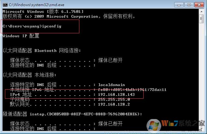 7、接下来我们要查看当前电脑IP,打开cmd窗口,输入ipconfig查看本机局域网地址
