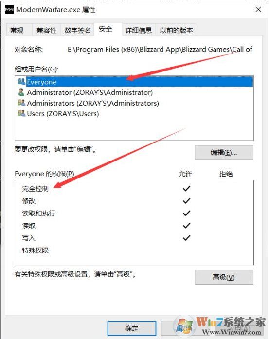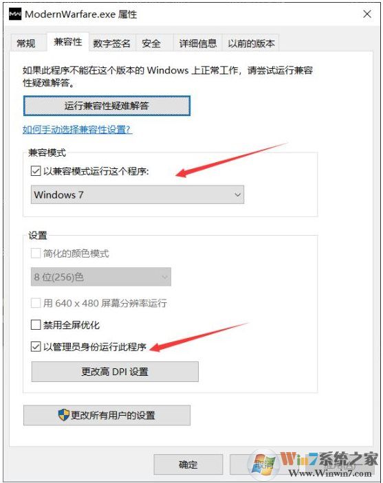 2、右键属性里面设置win7兼容模式,管理员权限,然后是设置权限里添加一个Everyone的账户,设置完全控制的权限。