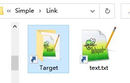Link 文件夹下面出现了一个带快捷方式角标的 new 文件夹,new 文件夹依然是存储在原来的 d:\simple\target 的位置。