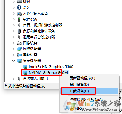 2、打开的设备管理器窗口中,展开“显示适配器”,在下面显卡上点击右键,选择“卸载”