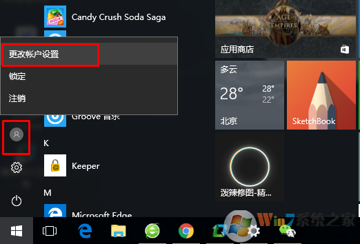 1、打开开始菜单,点击头像选择更改账户。