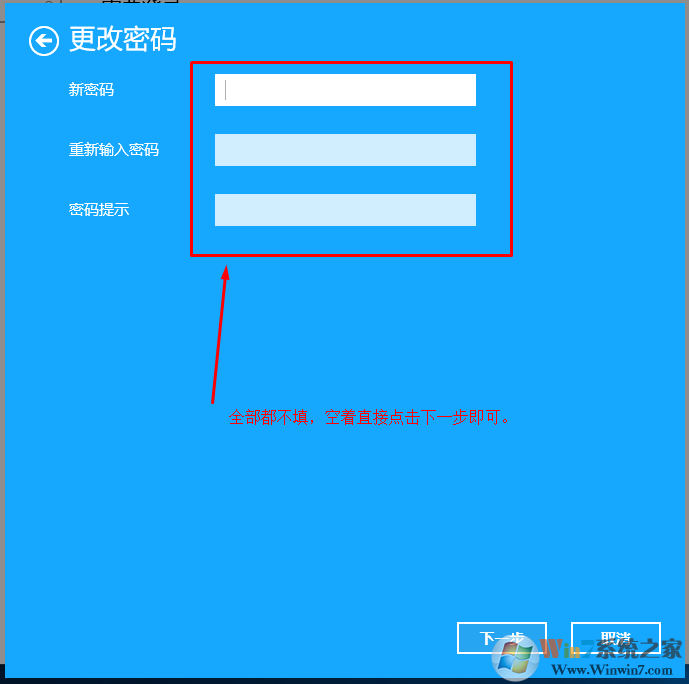 6、在输入新密码的时候不要输入,直接空白点击下一步。