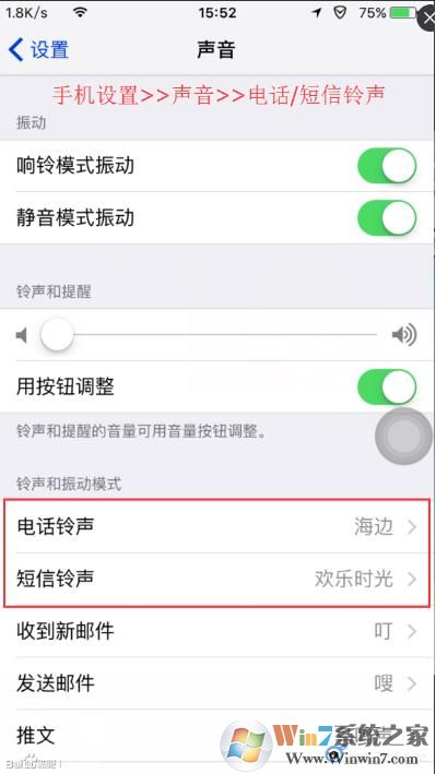 注意:(比较多用户反馈找不到导入的短信铃声,这是由于iOS系统统一导入的铃声为来电铃声,符合短信铃声的铃声可以在短信铃声下方进行设置)