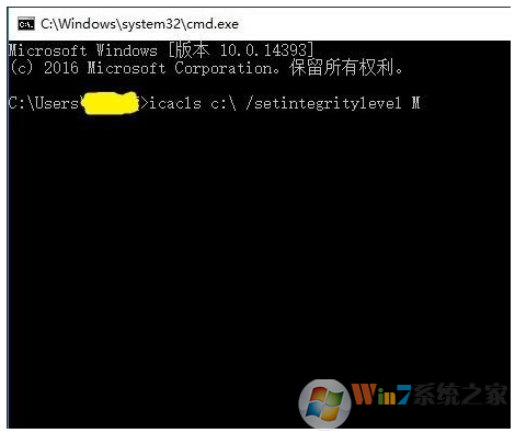2、在命令提示符中输入:icacls c:\ /setintegritylevel M 按回车键后等1分钟,会出现“已成功处理一个文件”;