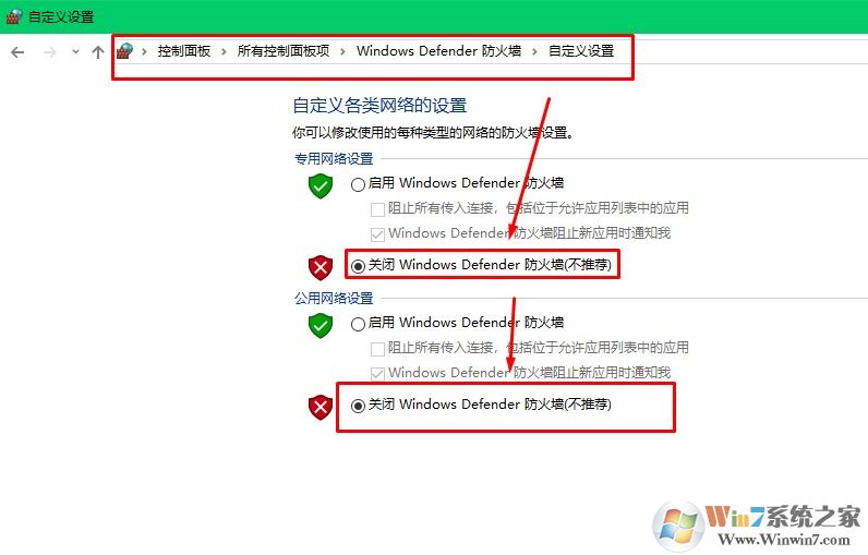 3、点击启用和关闭windows defender 防火墙。并关闭所有网络状态下的防火墙。