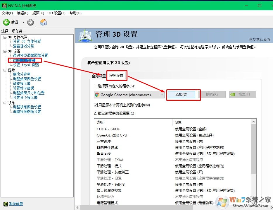 二、将出现该错误的程序添加到NVIDIA 3D设置中。