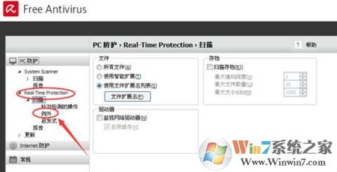 步骤2、打开小红伞配置界面找到,real-time -protection -----扫描----列外菜单 设置,如图: