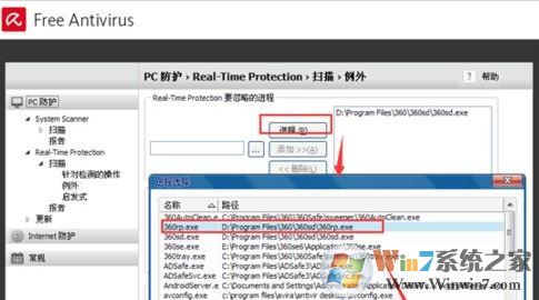 步骤4、设置进程排除例外,点击进程之后,会列出当前正在运行的经常,选择其中需要列外的经常,点击确定;