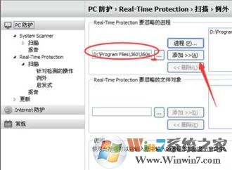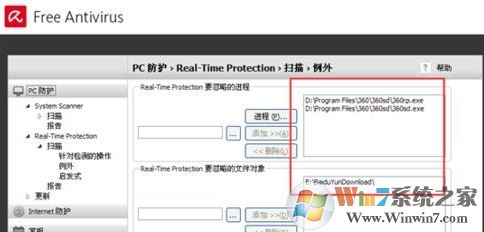 步骤3、设置进程排除列外,进入列外菜单有进程,和对象文件夹列外,如图: