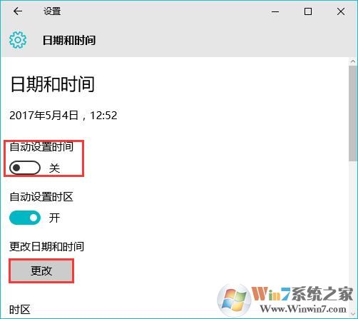 2、在下面将【自动设置时间】关闭,点击【更改】;