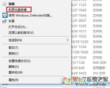 1、当我们在Win10 ISO镜像文件上点击右键时,弹出的右键菜单中会有“刻录光盘映像”选项。如图: