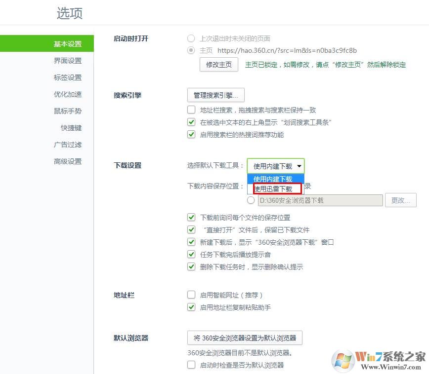 1、打开360浏览器的设置,然后在选择默认下载工具中,我们选择使用迅雷下载即可。