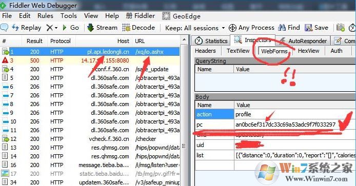 寻找Host带有:ledongli.cn的数据,点击后,查看右边的详情信息框,只要出现“pc=”的信息就可以了。记录下获取到的pc值!!