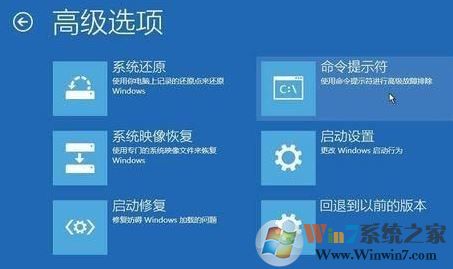 2、看到高级选项界面 点击高级选项-->疑难解答-->高级选项-->命令提示符。
