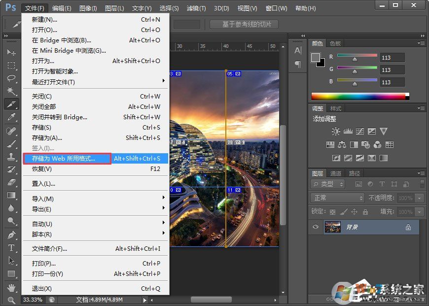 4、保存时,选择文件》存储为WEB和设备所用格式,这是一种专门为网页制作人设置的格式。