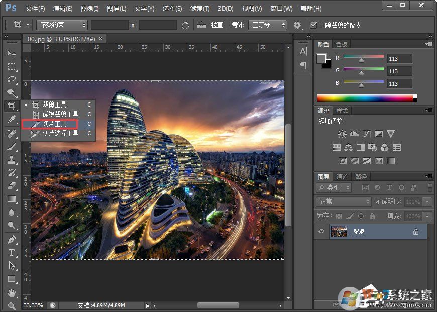 2、把图片缩放到合适的大小,然后选择左手边工具栏上的一把像小刀一样的工具,然后右击,出同三个选择,选择“切片工具”
