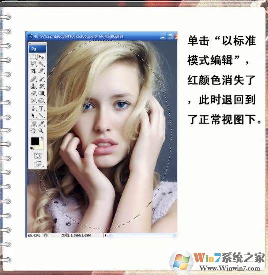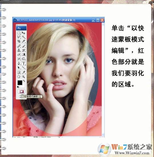 2、用“以快速蒙板模式编辑”工具,出现的红色部分就是我们要羽化的区域。