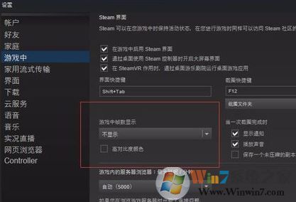 3、进入“游戏中”设置界面,在图中圈出的位置可以设置FPS显示位置和对比颜色,如图: