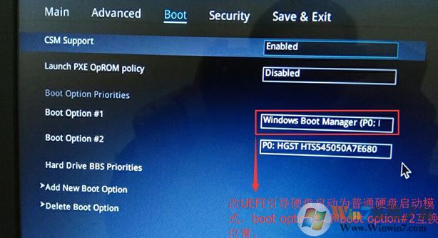 3、继续把boot option#1选项改为普通引导的,boot option#1和boot option#2硬盘启动位置对换,设置第一启动项为普通硬盘引导,带Windwos Boot Manager的为UEFI引导分区;