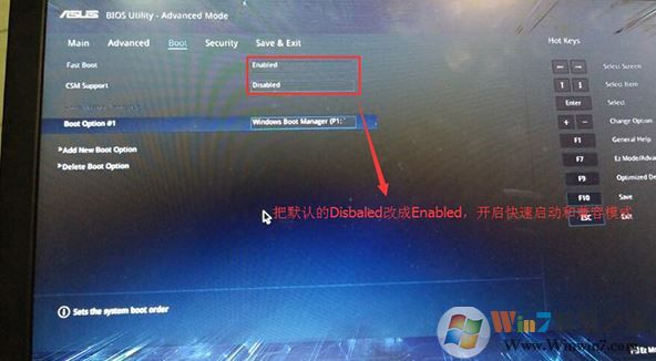 2、重启后切换到BOOT的选项,分别把fast boot和csm support由disabled改成enabled,分别开启快速启动和兼容模式;