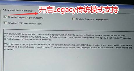 2、切换到Advanced Boot Options将右边的Enable legacy option roms选项打勾,如图: