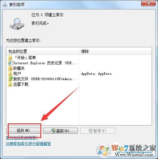 2、在打开的索引选项对话框中,可以看到默认的为哪些位置建立索引的内容。