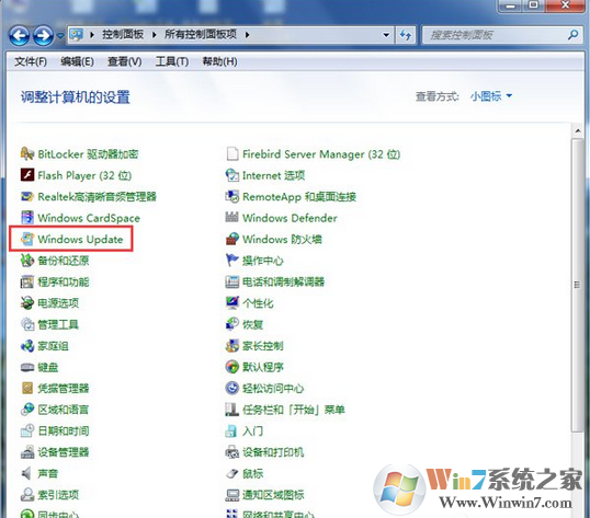 其次、在控制面板中找到“Windows Update”。并双击进入。