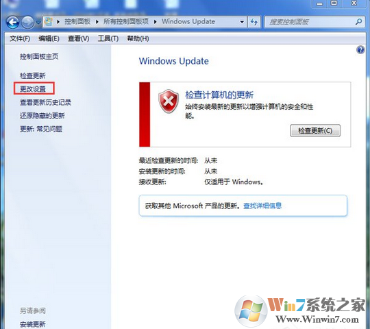在Windows Update中找到“更改设置”并双击进入设置界面