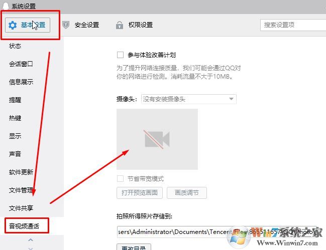 3、摄像头驱动安装好之后我们就可以使用摄像头了,运行QQ软件,打开“主菜单”--“设置”,打开系统设置后 在基本设置下方 往下移动点击“音视频通话”,在右侧就可以看到摄像头画面了!