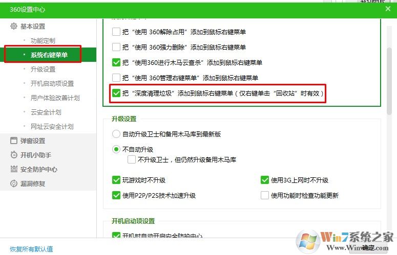 2、在左侧选择右键菜单,然后将为右键添加深度清理这个选项勾选