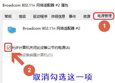 5、点击最右上角的“电源管理”,然后把下方的“允许计算机关闭此设备以节约电源”这一项前面的勾选去掉即可!