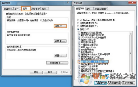4、右击"计算机"选择"属性",选择"高级系统设置",接着在"高级"选项卡中点性能"设置",勾选"显示缩略图,而不显示图标"选项,点击确定即可。