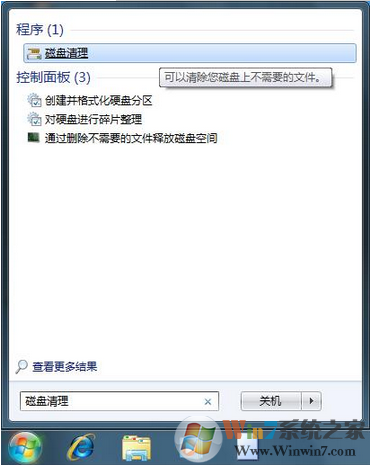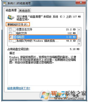 5、重建缩略图缓存,点击开始菜单,在开始菜单搜索框输入"磁盘清理",接着找到并打开磁盘清理工具,选择系统盘盘符(如C:),点确定,弹出对话框计算机时间不用管,然后只选择"缩略图",点确定,在弹出框点确认"删除文件"。