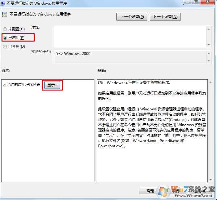 3、在打开的对话框里,选择“已启用”,然后点击“不允许的应用程序的列表”后面“显示”。winwin7.com