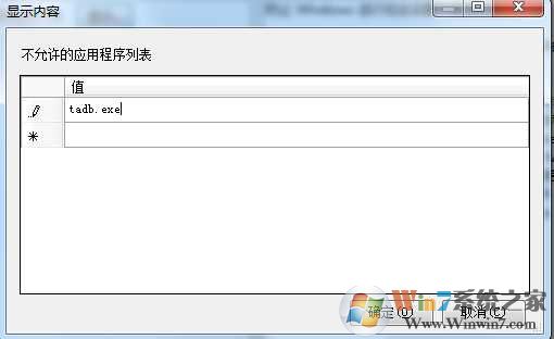 4、在弹出的“显示内容”的对话框里把想要禁止的程序输入即可。比如把tadb.exe添加进去。这样就可以禁止tadb.exe自己启动了,如你不想QQ运行,那么输入QQ.exe即可。主要是要找到那个程序的原名。